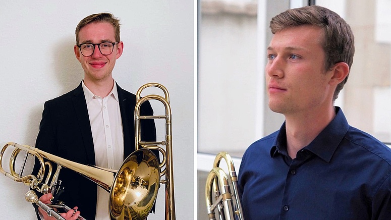 Die beiden Posaunisten Kilian Kiemer und Liam O'Mahony aus der Klasse von Prof. Matthias Gromer freuen sich über Ihre neuen Besetzungen in Saarbrücken und Essen.