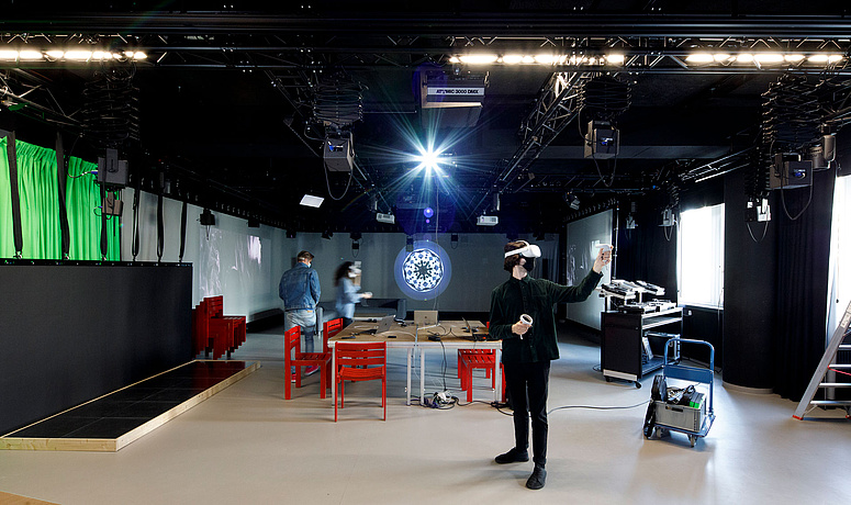 Es gibt dazu ein sehr umfangreiches Softwarepaket. Über ein Traversen-System an der Decke können wir die Technik im Raum fast beliebig anordnen. Es gibt ein komplexes Soundsystem, das wir als flexibles Multikanalsystem oder durch diverse Speziallautsprecher erweitern können. Mit den verschiedenen Formen der Projektions- und Displaytechnologie - dazu gehören auch modulare LED Technologie und Greenscreens - können wir sehr unterschiedliche Visualisierungen und VR Projekte realisieren. Eine gute Auswahl an netzwerkfähiger Lichttechnik sowie netzwerkfähige VR Kameras steht ebenfalls zur Verfügung.