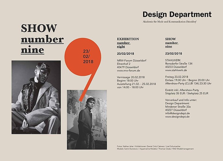 Am 23. Februar veranstaltet das Düsseldorfer Design Department im Stahlwerk seine Show number nine, bei der die diesjährigen Absolventen der Akademie für Mode und Kommunikation ihre Abschlusskollektionen präsentieren. Die Musik zu zwei dieser Kollektionen komponierten die IMM-Studenten Sebastian Heidelberg und Lambert Windges.