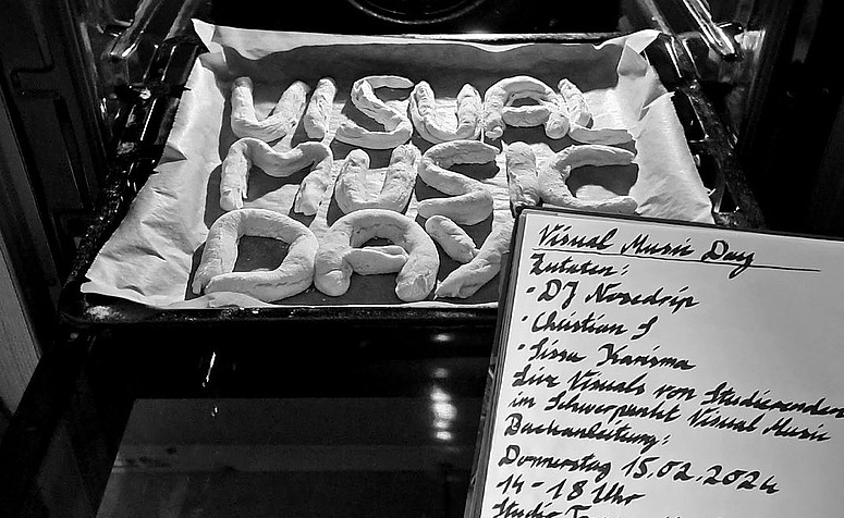 Die Studierenden im Schwerpunkt Visual Music entwickelten für den Visual Music Day 2024 in der Lehrveranstaltung »Musikvisualisierung im stillen Bild« bei Christian Schäfer die Plakatideen und in der Lehrveranstaltung »Musikvisualisierung im bewegten Bild« bei Leon Monschauer die Transformation der Plakate zu live generierten Visuals im Raum.