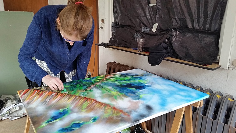 In diesen zwei Wochen im August und September arbeitete Sie auf dem 5. internationalen Sommercampus an einem eigenen Projekt, einer audiovisuellen Ortsbeschreibung von Kalbe, in der Sie ihre ersten Eindrücke der sächsischen Kleinstadt impulsiv und auf abstrakte Weise durch Formen und Farben in einer Malerei verarbeitete.