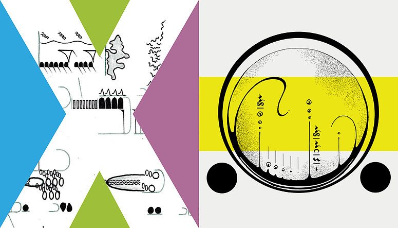 Im Rahmen des Seminars Bildkomposition und -Rhythmus untersuchen die Studierenden Musikvisualisierung in Form von Notationssystemen abseits unseres klassischen europäischen Notensystems. Zu dieser Lehrveranstaltung gehört auch die praktische Übung 'Stille Post'. Die Studierenden ziehen per Losverfahren jede:r ein Musikstück. Dieses wird grafisch visualisiert – jedoch ohne unser konventionelles Noten- oder Schriftsystem zu benutzen. Die so entstandenen Noten werden an eine:n andere:n Studierende:n ohne Musik, Titel oder sonstige Hinweise auf das Stück weitergegeben; diese Person spielt nun eine eigene Interpretation der Notation ein. Der neu entstandene Track bekommt einen Titel und wird wiederum weitergegeben und diesmal in Form eines Covers visualisiert. Die komplette Entwicklung – vom Original zur Neuinterpretation – ist in der Ausstellung zu sehen und zu hören.