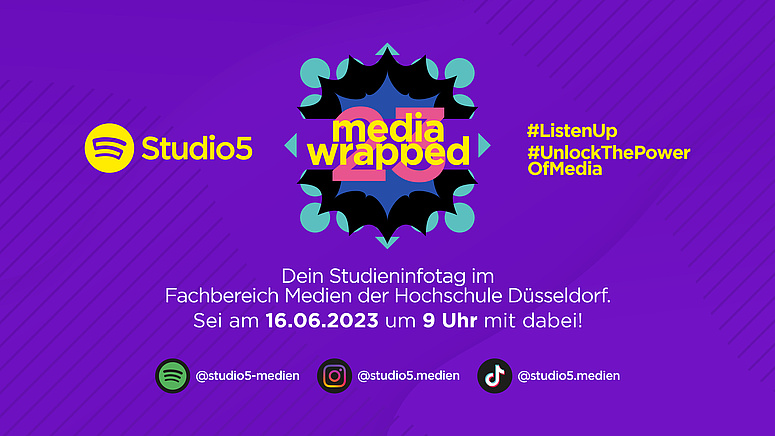 Studio5 steht für Studienorientierung im Fachbereich Medien der Hochschule Düsseldorf. Endlich, nach 3 Jahren erfolgreicher Online-Veranstaltungen, kann der Medien-Infotag wieder in Präsenz auf dem Campus der Hochschule Düsseldorf (HSD) durchgeführt werden, wobei ihr einen direkten Einblick in den Studienalltag im Fachbereich Medien erhalten könnt.