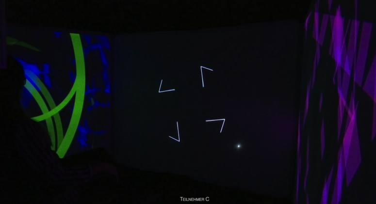 [C.B.]: Mein Kommilitone Lennart Melzer, der am IMM den <link studiengaenge master klang-und-realitaet>Master Klang und Realität studiert, hat mit Supercolllider Klang und Bild erstellt und mit Arduino gearbeitet, um später die Werte der Betrachter per Biofeedback einlesen und dann die Installation darauf reagieren lassen zu können.Der physische Aufbau bestand aus drei Leinwänden mit Beamern, die alle synchron liefen und je nach Reaktionen der Nutzerin bzw des Nutzer andere Animationen zeigten.