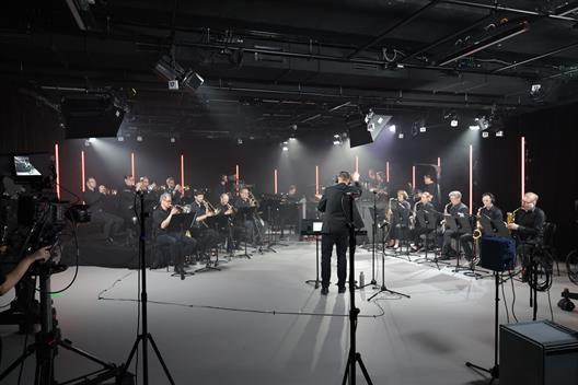 Unter der fachlichen Leitung von Prof. Jens Dreesen (Ton) und Prof. Enrique Sánchez Lansch (Bild) hatten die Studierenden die seltene und sehr willkommene Gelegenheit, ein großes Ensemble mit Kameras und Mikrofonen einzufangen. Die HSD Big Band ist auf die Ergebnisse gespannt - und hat gleich noch die professionelle Umgebung für ein neues Bandfoto genutzt.