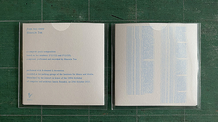 Die algorithmische Computermusik-Komposition basiert auf zwei mathematischen Zahlen (Wurzeln), die für zwei unterschiedliche gleichstufig temperierte Stimmungssysteme stehen: 21/12 aus der tr… mehr