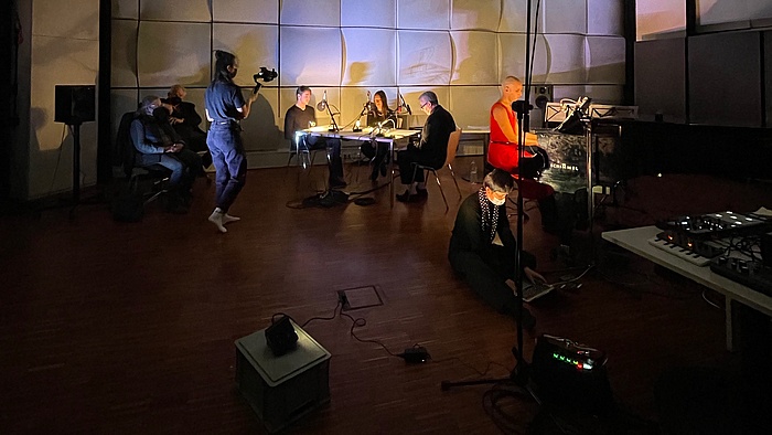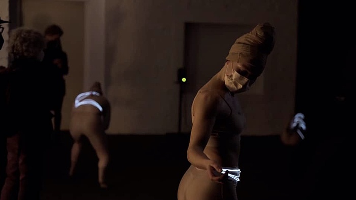 Die bewegte Skulptur Übertragung von Laura Jordan-Bertinelli wurde für Tänzer:innen und Livemusik konzipiert. Im Februar 2022 wurde sie durch Lena Valentina Hauth, Elodie Zermatten, Lea Marie Ne… mehr